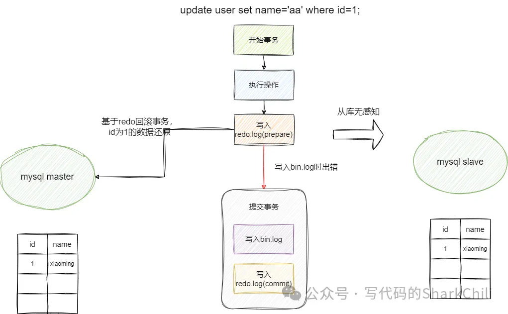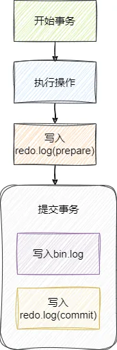 假设我们先写bin.log,当事务提交后bin.log写入成功,结果再写redo.log期间,数据库挂了。重启恢复后,主数据库根据早期redo.log(我们的redo.log没写入)恢复到bin log写入前的样子,而从数据库已经根据bin.log同步到了一份数据,最终从数据库比主数据库多了一条数据。所以MySQL设计者提出了二阶段提交的概念,整体步骤为: