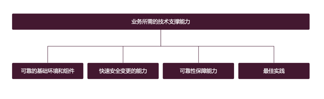 可靠的基础环境和组件:业务程序要运行,需要基础网络、硬件、操作系统、数据库、中间件等,需要这些环境和组件稳定可靠快速安全变更的能力:快速变更的能力,大家很容易理解,作为研发人员,写了一个feature或者做了个bugfix,肯定很想快速交付,但是变更很容易导致故障,变更需要受控,需要尽量确保安全可靠性保障能力:软件部署到生产环境之后,可能会遇到各类问题,如何能够提前做好风险量化,如何能快速发现问题、定位问题、快速止损,这可能是业务侧对运维侧最重要的诉求了最佳实践:业务依赖很多基础支撑能力,这些能力用的如何?是不是业界最佳实践?是不是公司内其他大部分业务的最佳实践?需要基础支撑团队反哺给业务各个能力如何获取