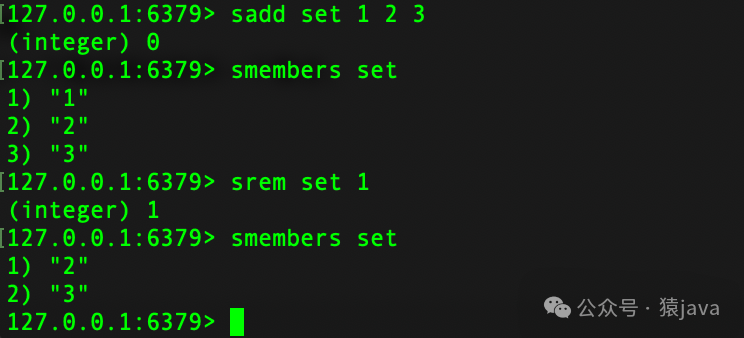 SADD key member [member ...] :向集合添加一个或多个成员。SREM key member [member ...] :从集合中移除一个或多个成员。SMEMBERS key:返回集合中的所有成员。SISMEMBER key member:判断指定成员是否是集合的成员。SCARD key:获取集合的成员数量。SRANDMEMBER key [count] :随机返回集合中的一个或多个成员。SINTER key [key ...] :计算多个集合的交集SUNION key [key ...] :计算多个集合的并集SDIFF key [key ...] :分别计算多个集合的差集。SMOVE source destination member:将成员从一个集合移动到另一个集合。(2) 应用场景