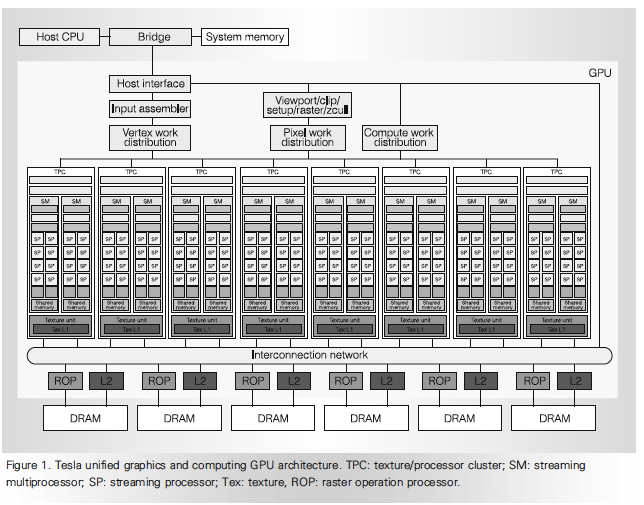 首代 Tesla 通过统一着色架构(Unified Shader Architecture)将传统分离的顶点着色器、像素着色器、几何着色器统一为可编程的流处理器(Streaming Processor)。该流处理器虽然设计上主要是处理可执行顶点、像素等着色图形任务,但也可执行与图形无关的计算指令,为通用计算提供了基础。