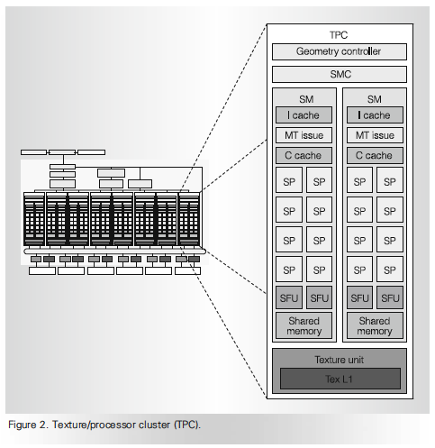 1)TPC texture/process cluster 纹理 / 处理簇TPC 纹理 / 处理簇首次实现了将传统 GPU 中分离的纹理处理单元和计算单元整合到同一模块中。这就是前面我们提到的(Unified Shader Architecture)的含义。