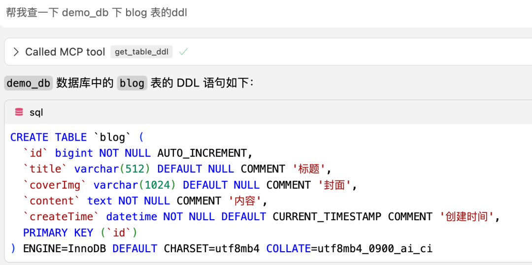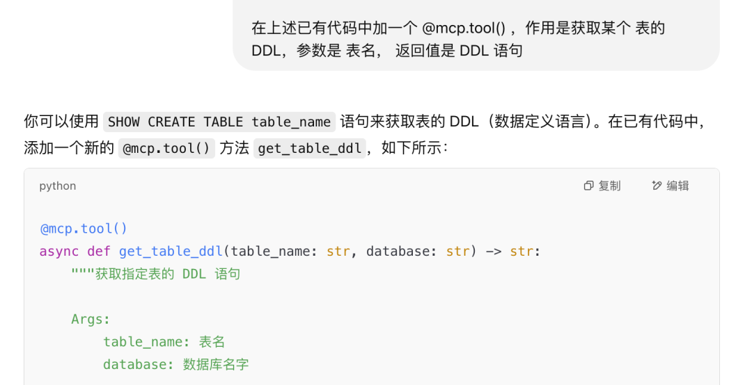 3)稍微改了下上面的代码之后,我又让 GPT 给我加了一个获取某表 DDL 的功能,这样就更省事一点,使用的时候就不用我告诉它了: