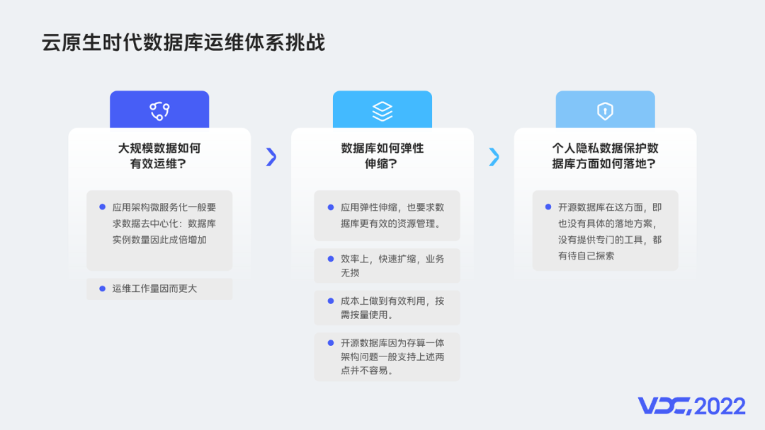 云原生时代应用架构普遍微服务化,一个系统拆成多个微服务,这个系统的数据库也分拆成多个。这导致数据库实例成倍增加,数据库的运维工作量也成倍增加。因此大规模数据库实例如何有效运维?这就是第一个挑战。云原生理念应用架构层面的弹性伸缩,自然也要求数据库层面做到弹性伸缩。具体来说,是效率上做到快速扩缩,业务无损,成本上也要做到,按需按量使用。但是主流开源数据库本身是存算一体架构,这两点支持不容易。数据库如何做好资源弹性伸缩?这是第二个挑战。数据库安全方面,个人隐私数据需要保护,这个必要性无需多说,但是怎么技术落地?怎么识别个人隐私数据,识别之后又如何进行数据加密。而开源数据库在这方面,即也没有具体的落地方案,没有提供专门的工具,这些都有待自己探索。这是第三个挑战。挑战讲完了,接下来我们看下vivo在这三个挑战方向的应对。