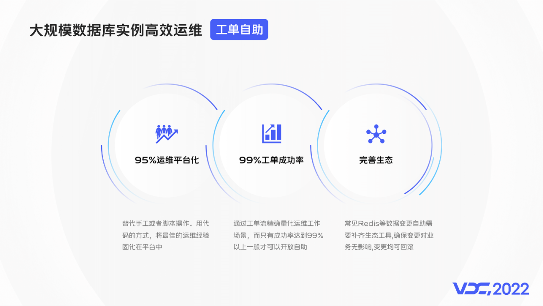 首先,vivo自研了数据库运维平台DaaS来支撑数据库运维工作。在规模覆盖、效率提升、故障告警处理等层面均衡发力,保障了数据的稳定性,以工单自助,故障自愈为核心,实现了数据库的高效运维。