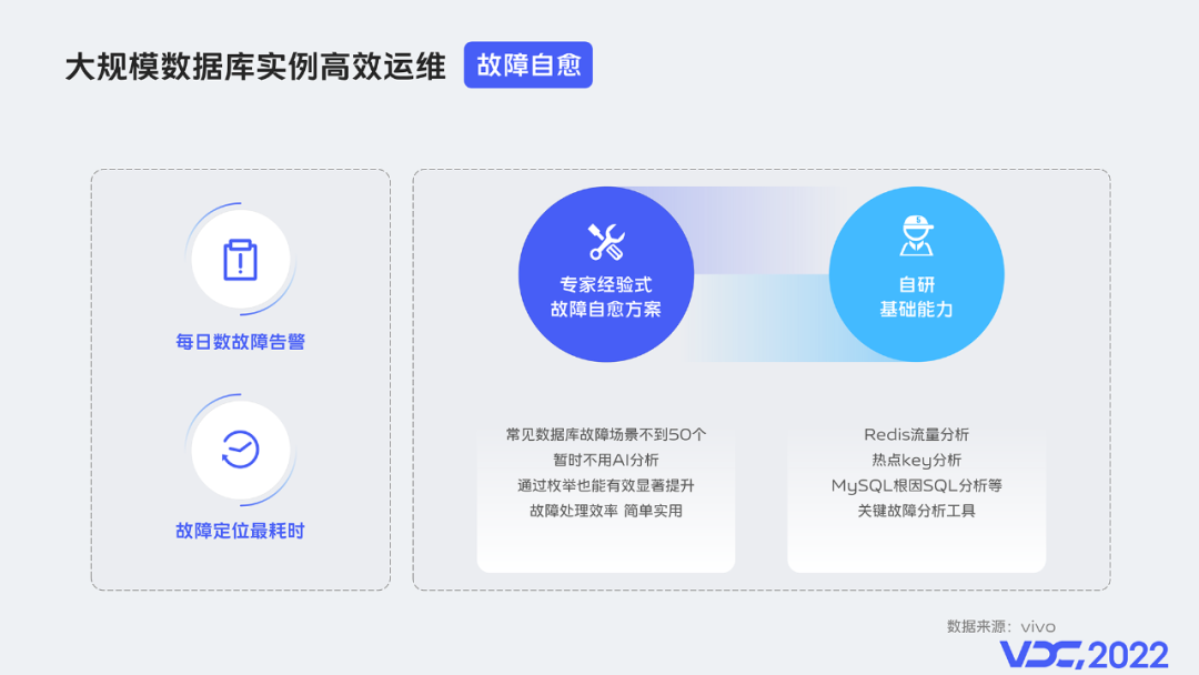 95%运维操作平台化,用平台操作替代手工或者脚本操作。所谓平台化的本质,就是用代码的方式,将最佳的运维经验固化在平台中。这才是一切运维效率的基础。99%工单成功率,一方面是要做到,所有运维操作都有工单流记录,这是运维工作量化和进步的基础;另一方面,因为异常的工单还是要数据库专业运维介入处理的,所以只有工单一键执行成功率达到99%以上才可以开放自助,才谈得上提升了效率。部分开源数据库生态工具是空白的,例如常见数据库Redis 要数据变更自助,一方面需要做到变更过程业务无影响,这要求做好变革速度&负载控制,变更前排除大key等风险因素。另一方面还需要做到变更过程数据安全,这要求变更前做好备份,变更后可随时回滚。这些都没有现成开源工具集成,vivo是通过自研逐个填补了这些工具空白。2.3 故障自愈随着数据库规模的成倍增加,故障告警的数目也急剧增多,vivo日均数百数据库故障告警,存粹靠手工进行告警问题排查处理越来越不能满足数据库稳定性的要求。