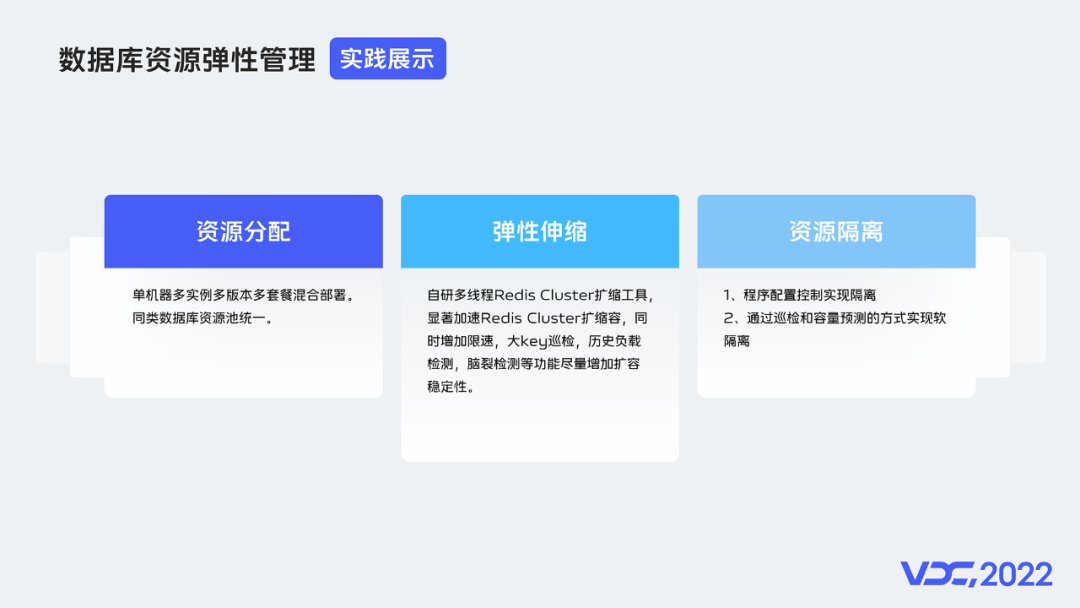 传统数据库占主流,从数量上看,线上数据库数万个实例,85%是REDIS,10%是MySQL,剩下5%是其它数据库。都是存算一体的传统数据库,弹性伸缩能力并不完美,例如开源Redis Cluster的弹性伸缩是单线程的,上了一定数据规模后其扩缩速度和稳定性都有待进一步提升。当前数据库资源管理还没有容器化,数据库资源隔离得另想办法。同时对于Redis等传统数据库来说,容器化也不能解决其弹性伸缩的速度和稳定性问题,这些都只能从数据库软件本身上去解决。目前数据库资源都是直接部署在物理机上,PB级数据直接部署在数千台物理机上,数据库成本问题比较敏感。3.2 资源弹性管理主要实现点针对上述问题,vivo数据库平台主要做了如下工作: