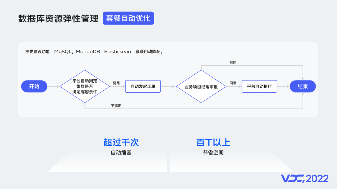 第一步 平台自动扫描全网数据库实例,挑出其中被认定是满足缩容条件的。第二步 平台自动发送缩容工单交由实例对应的业务项目经理审批。第三步 根据审批结果执行缩容,或者放弃本次缩容。大概在这个功能上线后的4个月内,平台自动发起超千次缩容,节省了超百T空间。