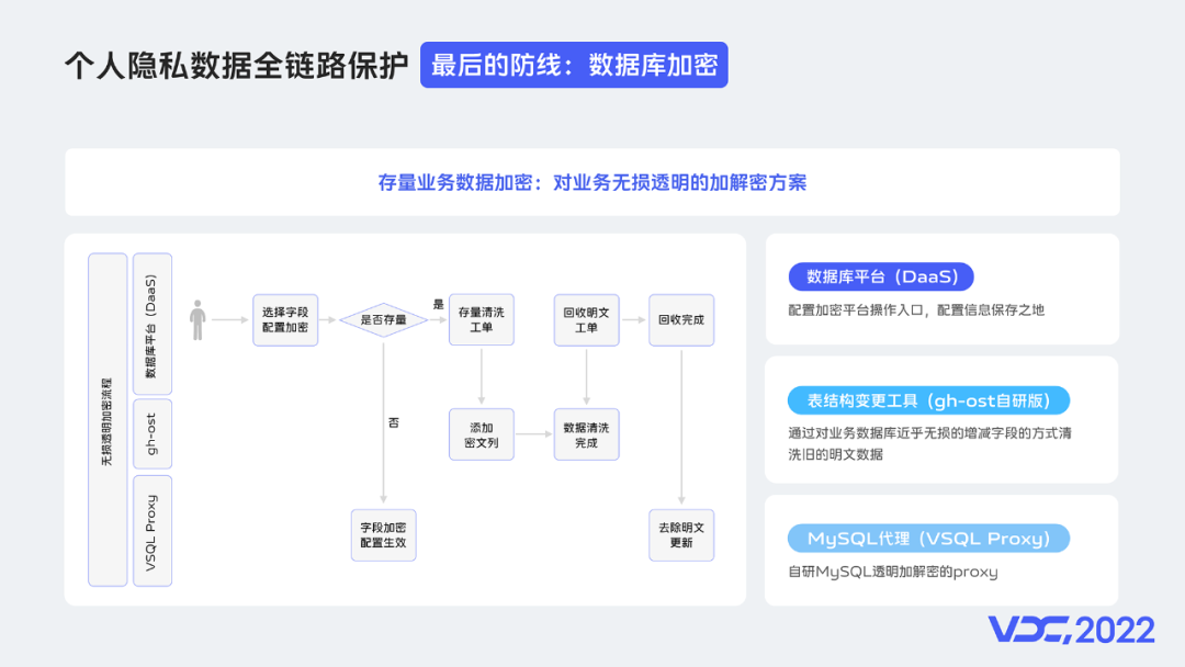 而当个人隐私数据识别出来了,处理的主要手段就是加密,所以平台也提供了对业务几乎无影响的,MySQL的透明加密方案,来减轻因为隐私数据加密带来的研发和运维工作量。4.2 全链路功能隐私数据库保护应该是贯穿业务研发阶段,运营阶段的全链路保护。