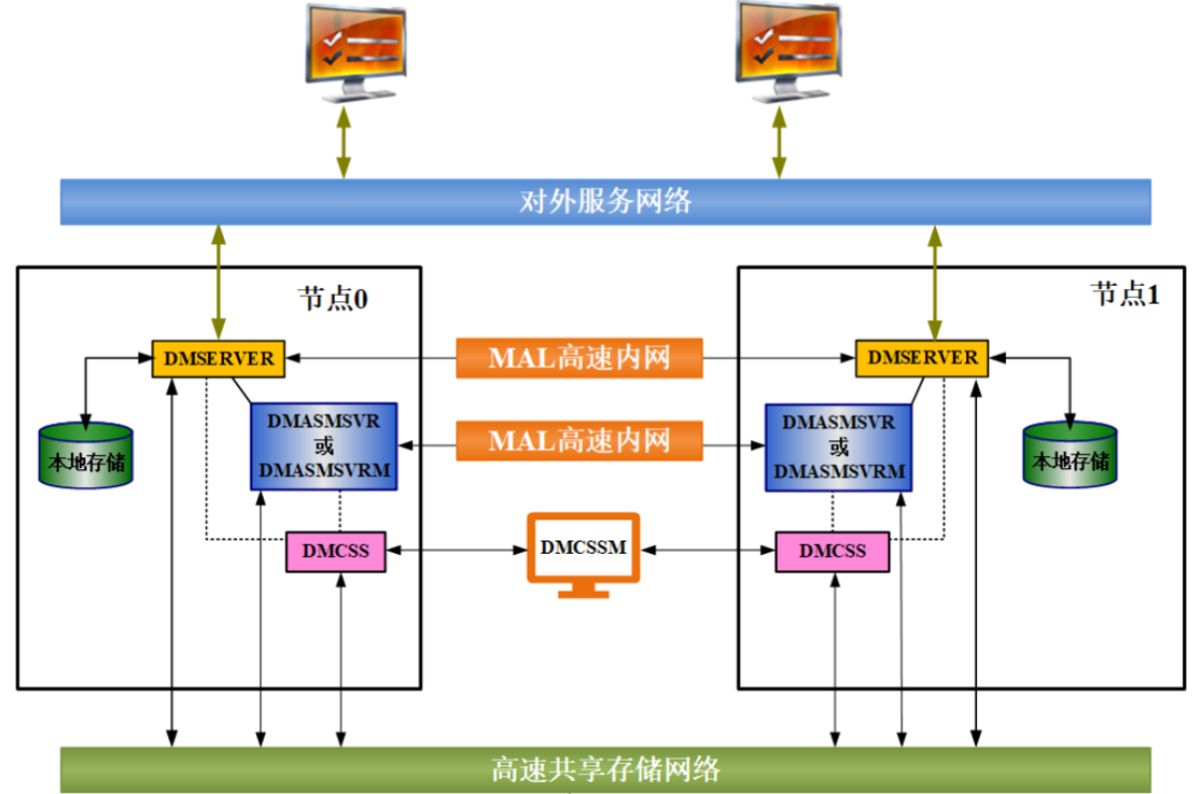 以达梦共享集群架构为例,在同一个站点内实现RAC共享存储架构,实现存算分离,计算实例有多个可以并发读写,数据文件、控制文件在集群系统中只有一份,这些文件保存在共享存储上。另外在共享存储上使用DMASM 文件系统管理共享存储设备,并通过配置DMASM 镜像提供多副本技术。当出现磁盘损坏或数据丢失时,系统无需人工干预即可利用其他镜像副本继续提供数据库服务,同时又可以自动或手动通过使用其他镜像副本进行数据恢复。