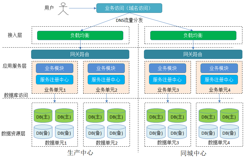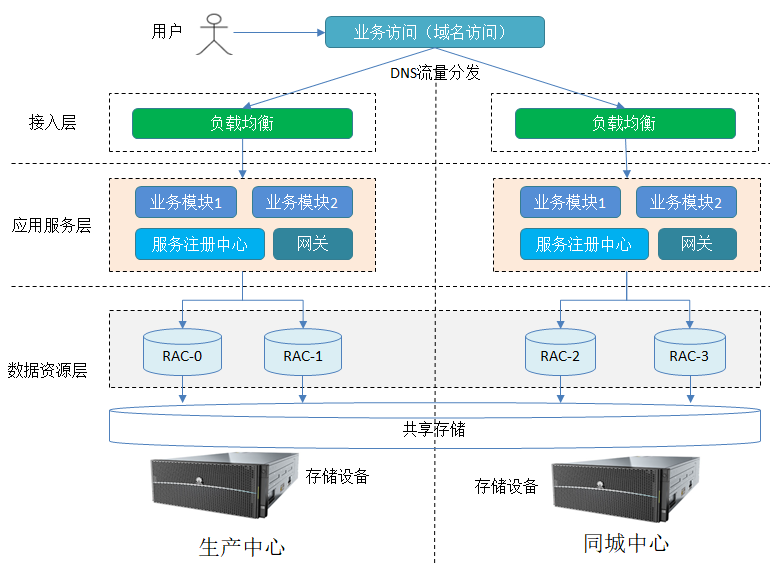 高可用性:由于有两个或多个数据中心同时运行,当一个数据中心出现故障或维护时,另一个数据中心可以迅速接管服务,确保业务的连续性和稳定性。这种架构显著提高了系统的容错能力和可用性。负载均衡:同城双活架构可以实现流量的动态分配和负载均衡,根据各个数据中心的负载情况,智能地将用户请求分发到不同的数据中心,从而优化资源利用,提高系统的整体性能和响应速度。容灾备份:同城双活架构相互之间具备容灾备份的功能。当一个数据中心出现故障时,另一个数据中心可以迅速接管业务,确保数据的完整性和业务的不间断运行。在双活架构的实现上,由于应用多数是无状态的,通过DNS和负载均衡在接入层实现流量动态分发,应用层按照竖井式架构部署,如下图所示。生产站点和同城站点在部署资源上完全对等,并具备同时接管承载两个站点流量的能力,当生产站点或者同城站点的应用出现异常时,将流量快速切换到一个站点,提升了业务的可用性。