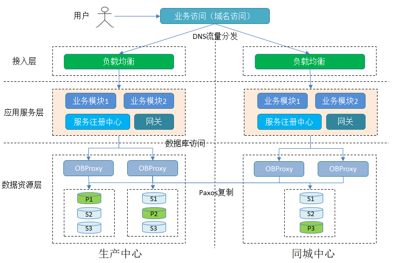 2.4 原生分布式数据库实现原生的分布式数据库具备数据自动分片的功能,以OceanBase数据库为例,它将大表划分为多个较小的分片(Tablet),这些分片自动分布到多个节点上,每个节点处理数据的一部分。另外每个分片有多个副本,并分布在不同的节点上,副本之间通过Paxos一致性算法实现数据一致性。当生产和同城部署在同一个数据库集群中,通过配置分片的策略,在双中心都会有主节点分布,也就是实现了生产和同城同时写的操作。