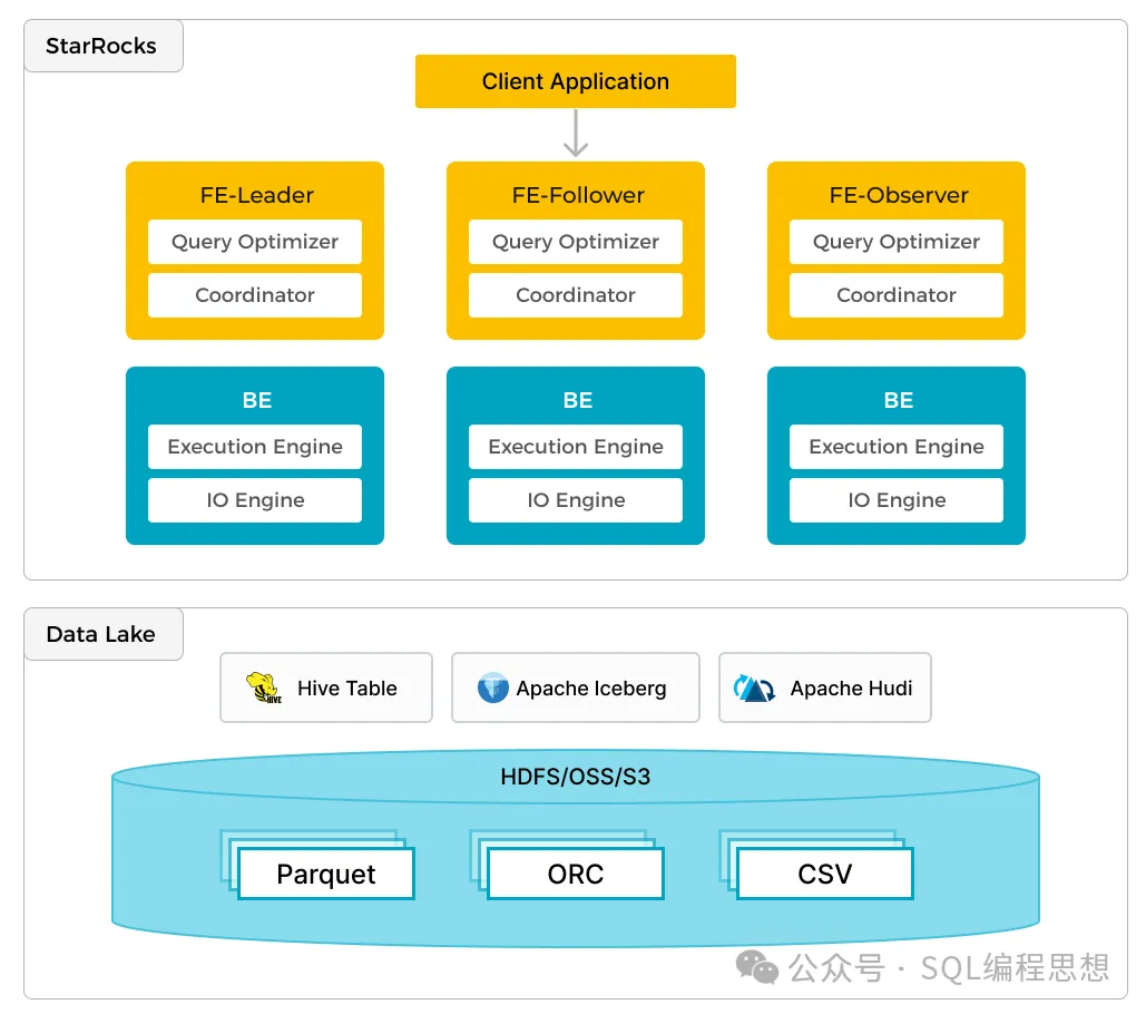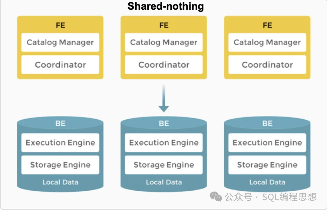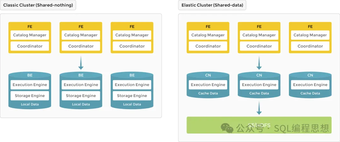 在存算一体架构中,StarRocks 由两种类型的节点组成:FE 和 BE。