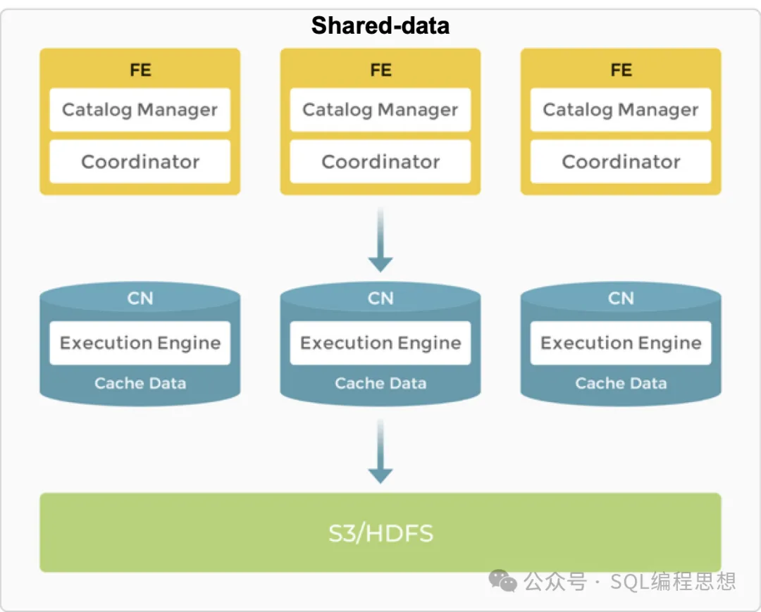 在存算分离架构中,BE 被“计算节点 (CN)”取代,后者仅负责数据计算任务和缓存热数据。数据存储在低成本且可靠的远端存储系统中,如 Amazon S3、GCP、Azure Blob Storage、MinIO 等。当缓存命中时,查询性能可与存算一体架构相媲美。CN 节点可以根据需要在几秒钟内添加或删除。这种架构降低了存储成本,确保更好的资源隔离,并具有高度的弹性和可扩展性。
