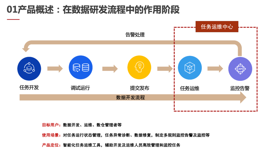 下图是从用户日常运维视角来看的产品闭环图。任务运维中心的本质就是为用户打造从发现问题、定位问题再到解决问题的完整、高效的运维链路。尤其是现在企业用户数据爆发增长,数据任务往往具有任务量庞大、调度类型复杂、业务影响范围广等特点,任务运维人员往往肩负巨大压力,一个智能高效的运维平台能够帮助运维人员提高工作效率、最大化减少因故障处理不及时而产生的损失,保障数据任务健康运行。