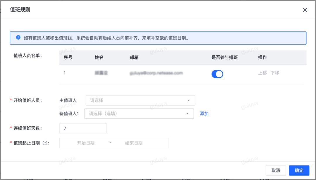 任务运维中心支持设置值班组,创建值班组后,可以添加值班人员,并设置值班规则,指定主值班人与备值班人以及连续值班天数和值班时间。