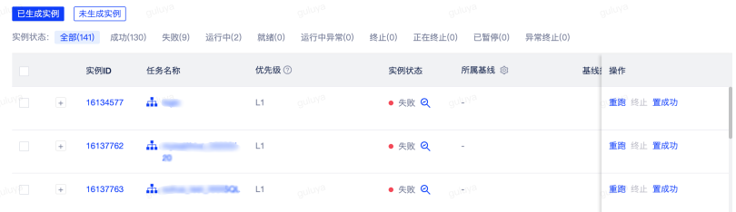 当我们发现任务出了问题,并且定位到了失败原因,通过修改代码、重新发布上线后,还需要将原先运行失败的问题进行重跑操作。如果实例状态是失败、终止,则支持实例重跑/批量重跑。