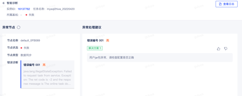 智能诊断的详情页面展示异常节点,以及异常处理建议。例如下图,就是针对数据同步节点运行失败所提供的诊断结果与处理建议。