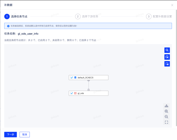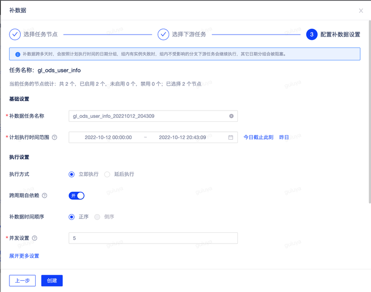 这里用gl_ods_user_info任务为例,这个任务首次执行时间是2022年7月份的某一天,我想要补这个任务以及他的下游任务2022年6月份的数据,我就可以使用补数据功能。