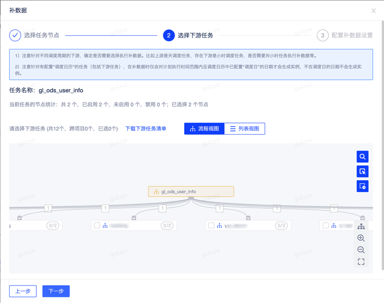 第二步:选择下游任务要补数据的节点,这里任务有点多,我可以根据实际需要来勾选要补数据的任务节点