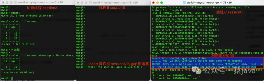 事务A(sessionA)在加共享锁的时候产生了间隙锁(Gap Lock)事务B(sessionB)对间隙中进行insert/update操作,需要先获取排他锁(X),导致阻塞事务C(sessionC)通过show engine innodb status\G指令可以查看到间隙锁的存在。需要说明,间隙锁只是锁住间隙内部的范围,在间隙外的insert/update操作不会受影响。