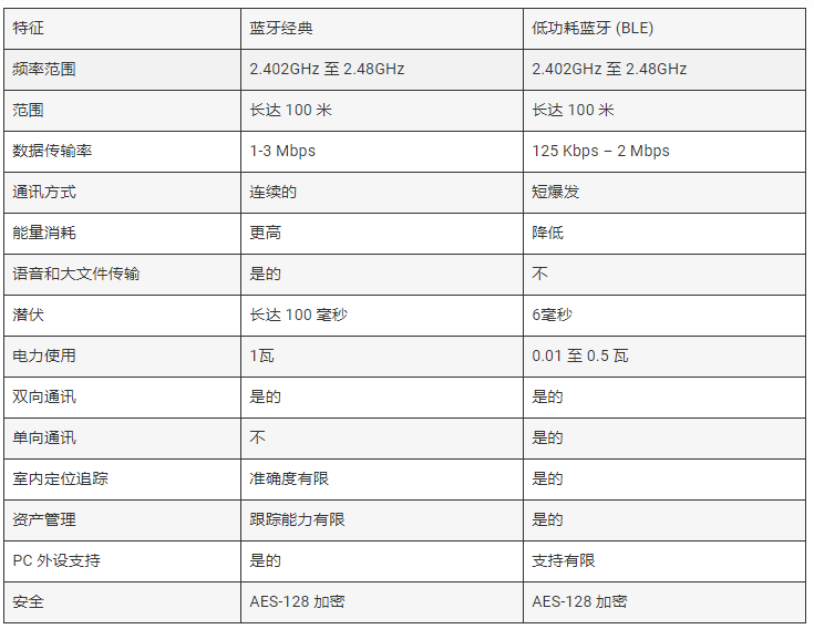 经典蓝牙适用于需要更高数据传输速率、连续通信和语音功能的应用。另一方面,BLE针对低功耗物联网设备进行了优化,具有短突发通信和小数据传输。下表显示了两种技术的比较分析,这将有助于理解为什么BLE在物联网应用中如此受欢迎。