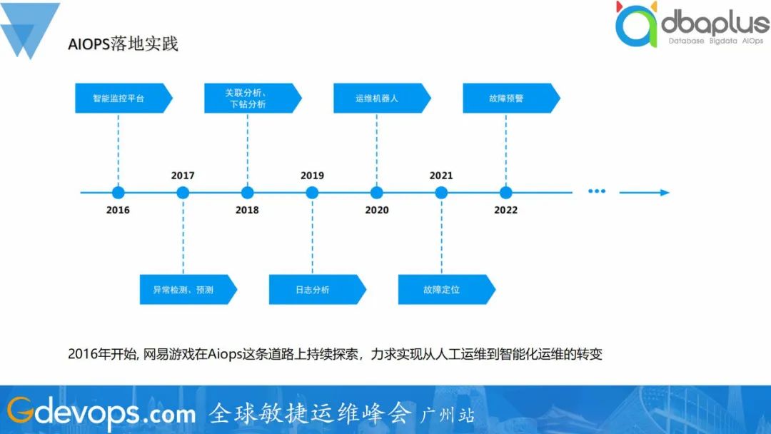 2016年开始, 网易游戏在AIOps这条道路上持续探索,力求实现从人工运维到智能化运维的转变。从2016年开始组建智能监控团队,构建智能运维平台,一直到现在,落地了异常检测、预测、关联分析、下钻分析、日志分析、运维机器人、故障定位、故障预警等。除此之外,还有很多其他功能,如火焰图分析、硬件预测、CDN文件发布等,都取得不错的实践效果。