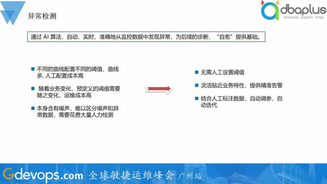 异常检测是研究AIOps的必经之路,后续很多场景功能都以异常检测为基础,属于不得不解决的问题。异常检测指通过 AI 算法,自动、实时、准确地从监控数据中发现异常,为后续的诊断、“自愈”提供基础。相比传统阈值配置成本高、误报多、场景覆盖少的问题,异常检测有易配置、准确率高、场景覆盖面广、自动更新等优点。