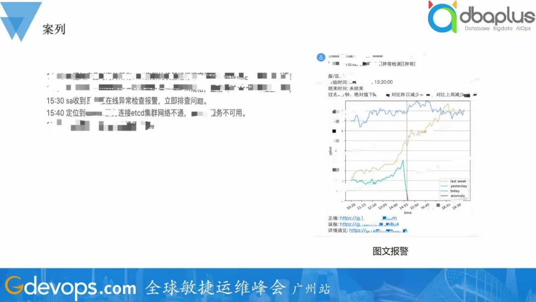 可视化部分包含图文告警、快速标注、异常视图三个模块。通过图文形式进行报警,在报警消息中加上快速标注链接,用户在收到报警后可以快速确认是否有异常发生并标注。