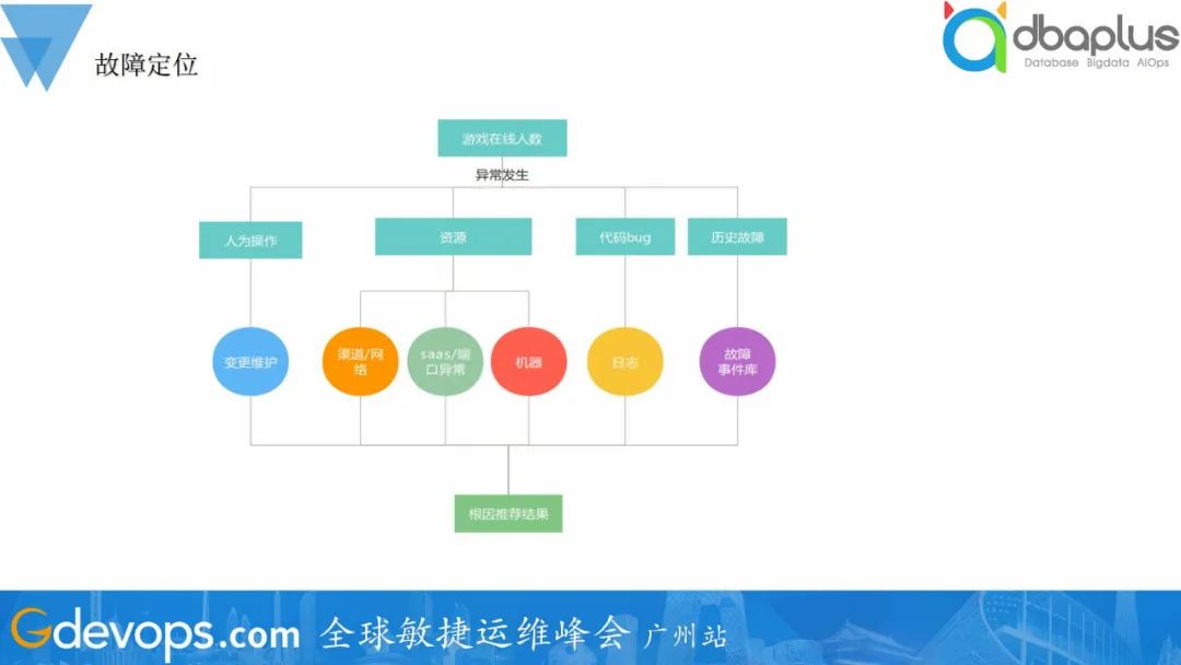 整体的故障定位流程,检测到故障的发生,基于拓扑资源、代码、人为因素、历史故障这几个角度出发,采用不同的方式进行根因分析。如检测到游戏在线人数下降,出发故障定位流程,检测到机器A 网络连接异常,告警出网络问题,人工进行排查出公网故障导致。