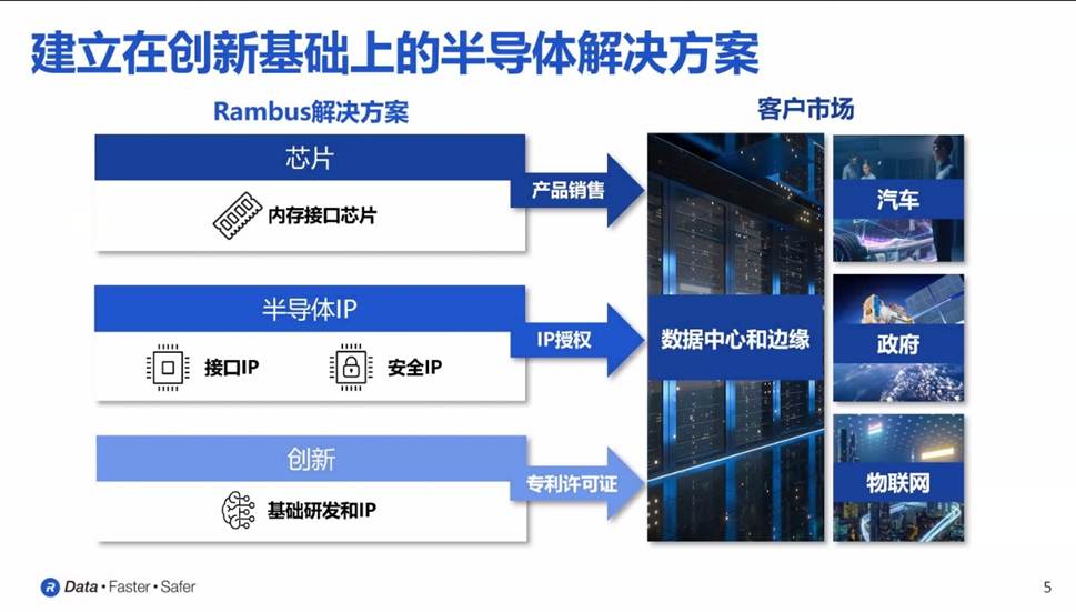 而以创新为基础,Rambus打造的半导体解决方案在三个层面发挥着作用,分别是:基础技术、半导体IP和芯片。在基础技术方面,35年以来Rambus开发了约2700项专利;在半导体IP方面,Rambus提供的IP主要由两大类组成:接口IP和安全IP;在芯片产品方面,Rambus目前为DDR4和DDR5内存模块提供了除DRAM颗粒以外所有的内存模块所需的芯片组,提供模块解决方案以及一站式的服务。