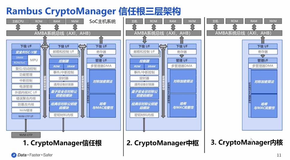 一站式解决方案为AI保驾护航Rambus最新发布的CryptoManager安全IP解决方案,包括了信任根(Root of Trust)、中枢(Hub)、内核(Core)三个系列。