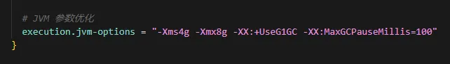 execution.jvm-options = "-Xms4g -Xmx8g -XX:+UseG1GC -XX:MaxGCPauseMillis=100"1.