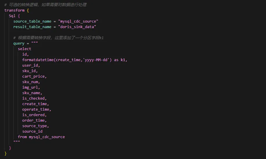只选择必要的字段,减少数据传输量在源端进行数据类型转换,减轻Doris负担使用适当的函数处理日期时间字段,确保与目标表类型匹配对于复杂转换,考虑使用多个转换步骤,提高可维护性2. 分区字段处理合理的分区字段处理可以提高Doris的查询效率: