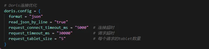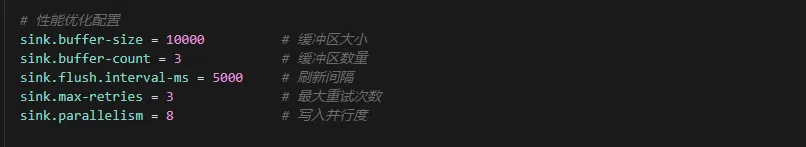 大表可适当增加buffer-size,提高批量写入效率buffer-count通常设置为3-5,避免过多内存占用调整flush.interval-ms,平衡实时性和写入效率3. Doris连接优化优化Doris连接参数可以提高写入性能: