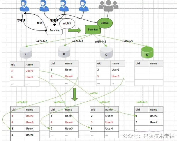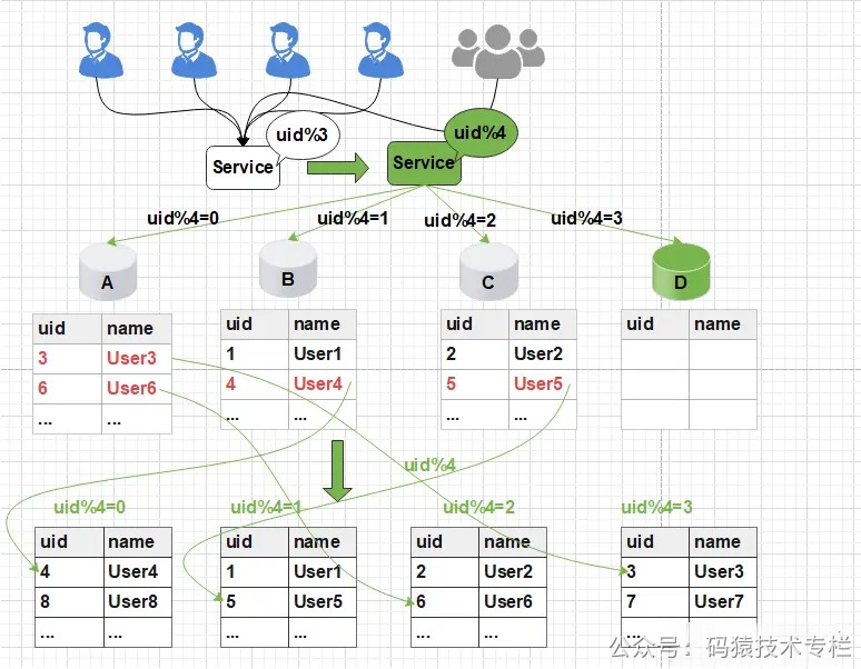 比如之前uid如果是uid=3取模3%3=0, 是分配在A库上,新加入D库后, uid=3取模3%4=3,分配在D库上;