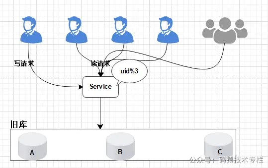 在项目初期,我们部署了三个数据库A、B、C,此时数据库的规模可以满足我们的业务需求。为了将数据做到平均分配,我们在Service服务层使用uid%3进行取模分片,从而将数据平均分配到三个数据库中。