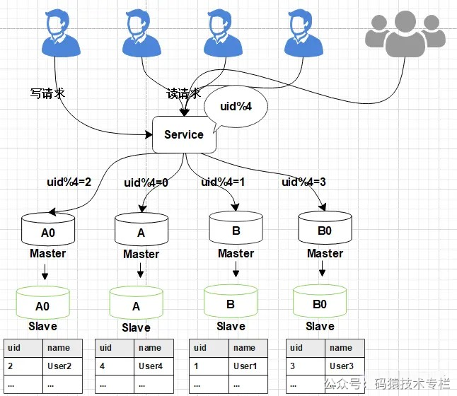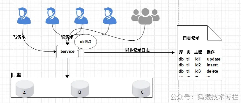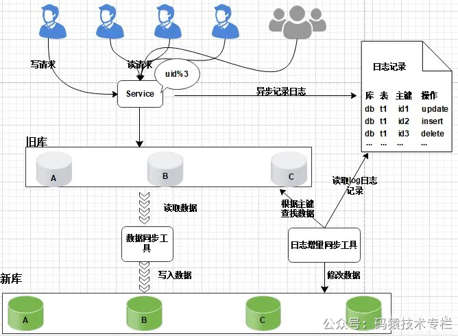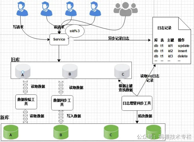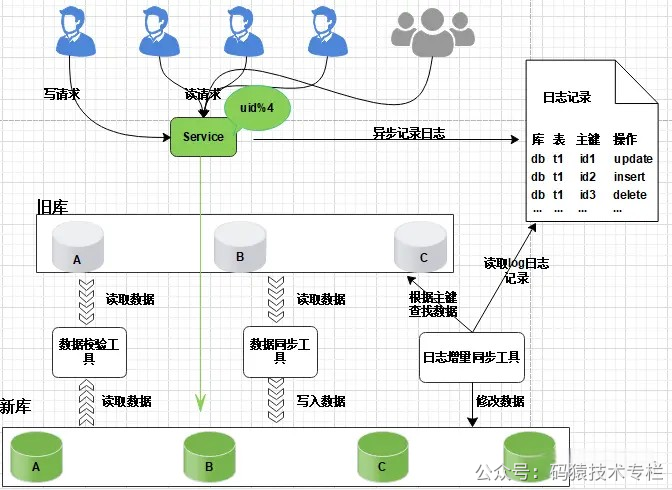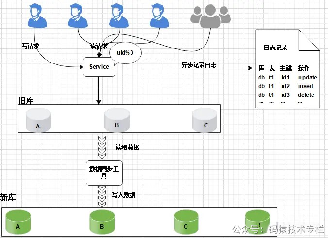 支持读写分离:数据库支持读写分离,在扩容之前,每个数据库都提供了读写功能,数据重新分配的过程中,将每个数据库设置为只读状态,关闭写的功能升级公告:为了进行数据的重新拆分,在停写之前,我们需要提前通知用户,比如:我们的服务会在yyyy-MM-dd进行升级,给您带来的不便敬请谅解。关注公众号:码猿技术专栏,回复关键词:1111 获取阿里内部Java性能优化手册!中断写操作,隔离写数据源(或拦截返回统一提示):在Service层对所有的写请求进行拦截,统一返回提示信息,如:服务正在升级中,只对外提供读服务数据同步处理:将旧库中的数据按照Service层的算法,将数据重新分配,迁移(复制数据)数据校验:开发定制一个程序对旧库中的数据进行备份,使用备份的数据和重新分配后的数据进行校验,比对更改配置:通过配置中心,修改Service层的配置算法,也就是将原来的uid%3变为uid%4,这个过程不需要重启服务恢复写操作:设置数据库恢复读写功能,去除Service层的拦截提示数据清理:使用delete语句对冗余数据进行删除回滚预案:针对上述的每个步骤都要有数据回滚预案,一旦某个环节(如:数据迁移等)执行失败,立刻进行回滚,重新再来