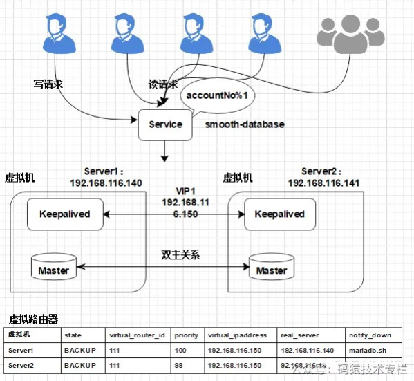 global_defs { router_idvip1 } vrrp_instanceVI_1{ stateBACKUP interfaceens33 virtual_router_id111 priority100 advert_int1 authentication{ auth_typePASS auth_pass6666 } virtual_ipaddress{ 192.168.116.150 } } virtual_server192.168.116.1503306{ delay_loop6 lb_algorr lb_kindDR//NAT|DR|TUN persistence_timeout0 protocolTCP real_server192.168.116.1403306{ notify_down/usr/local/shell/mariadb.sh weight1 TCP_CHECK{ connect_timeout10 retry3 delay_before_retry3 connect_port3306 } } }1.2.3.4.5.6.7.8.9.10.11.12.13.14.15.16.17.18.19.20.21.22.23.24.25.26.27.28.29.30.31.32.33.34.