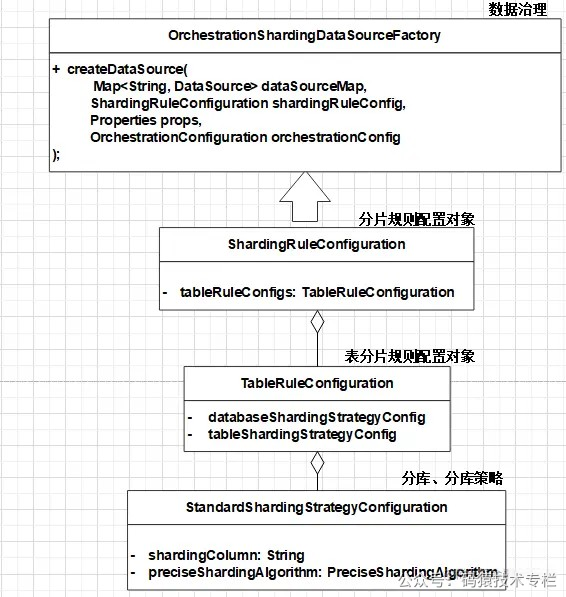 ShardingJDBC初始化流程1)配置ShardingRuleConfiguration对象2)配置表分片规则TableRuleConfiguration对象,设置分库、分表策略3)通过Factory对象将Rule对象与DataSource对象装配4)ShardingJDBC使用DataSource对象进行分库