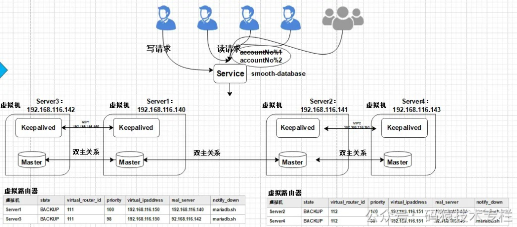 通过应用服务接口验证数据是否解除同步2.2.4 安装MariaDB扩容服务器新建两台虚拟机, 分别为Server3和Server4。在Server3和Server4两台节点上安装MariaDB服务参考2.1.1 MariaDB服务安装配置Server3与Server1,实现新的双主同步