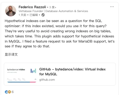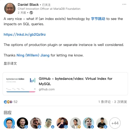 VIDEX 已经部署在了字节跳动大规模生产系统中,每天为数千用户、数十万慢 SQL 提供优化服务。VIDEX 的实用价值、工业级部署设计等特点,引来 Daniel Black(MariaDB Foundation 首席创新官)和Federico Razzoli (Founder of Vettabase) 等业界知名专家的点赞与认可。