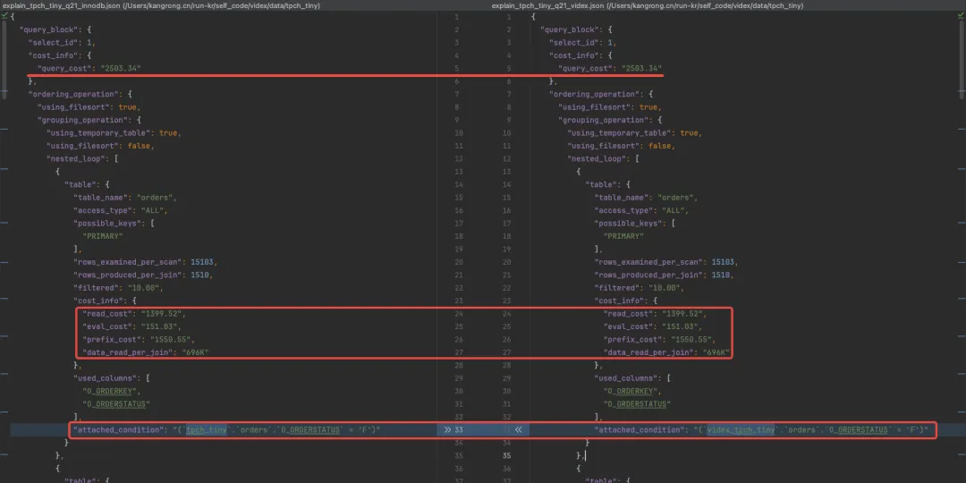 如下图所示,VIDEX(左图)能生成一个与 InnoDB(右图)几乎 100% 相同的查询计划。