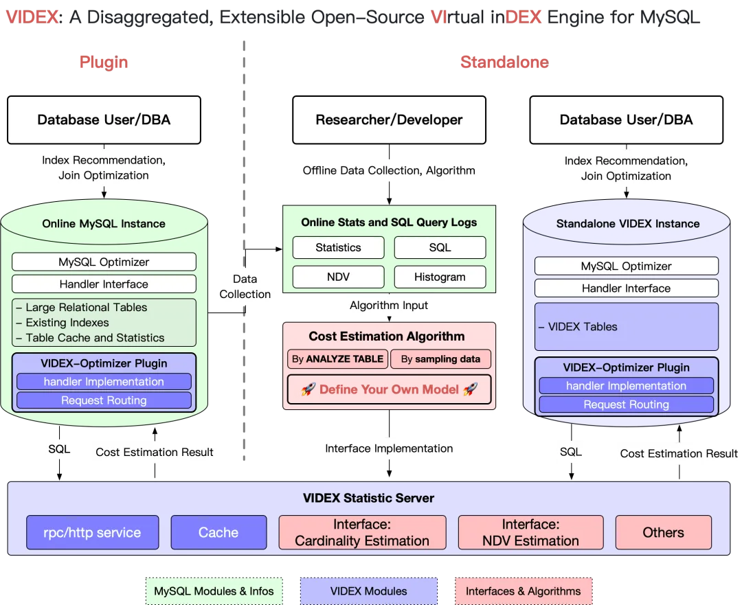 VIDEX 提供开箱即用的虚拟索引能力,可无缝集成至现有 MySQL 生态;对于数据库研究者,VIDEX 模块化设计允许新算法(如 NDV 估计、Cardinality估计等等)在 MySQL 上快速验证,推动前沿技术落地。