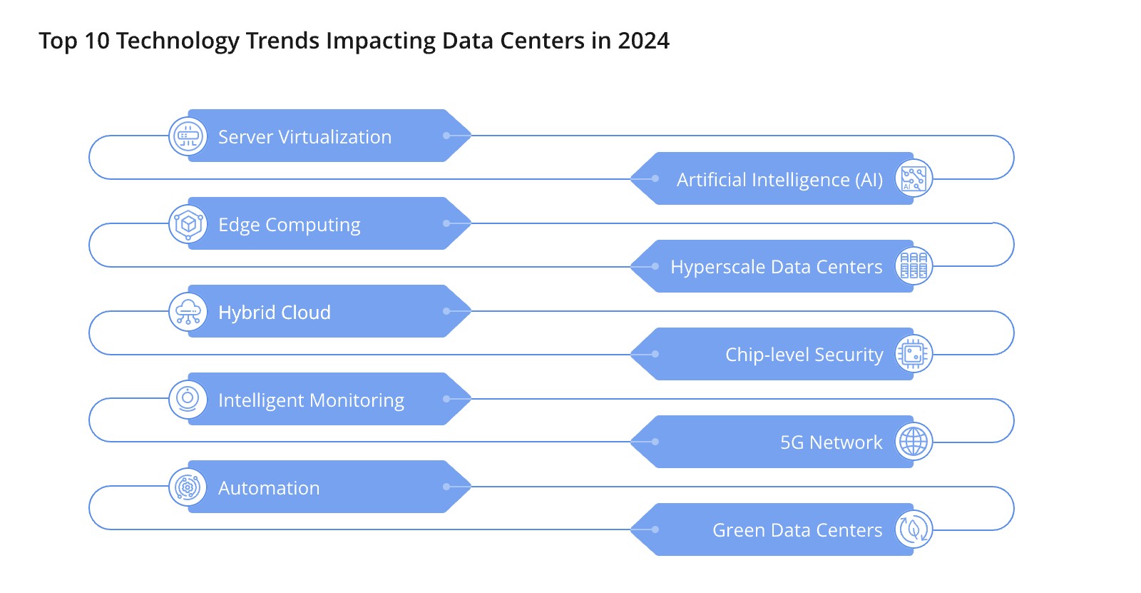 通过探索各个技术领域的进步,我们见证了近年来的重大进展,特别是在数据中心领域。 以下是塑造 2024 年数据中心未来的一些最新且有趣的趋势: