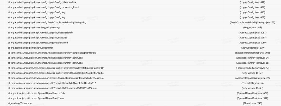 }日志框架对异常进行格式化转换时,有如下两个配置项可参考,默认配置是%xEx。1. %ex,仅输出异常信息,不获取扩展信息(JAR文件名称和版本信息)对应的格式转化类是ThrowablePatternConverter,在format方法内部并没有获取ThrowableProxy对象,所以不会触发解析、加载异常堆栈类。