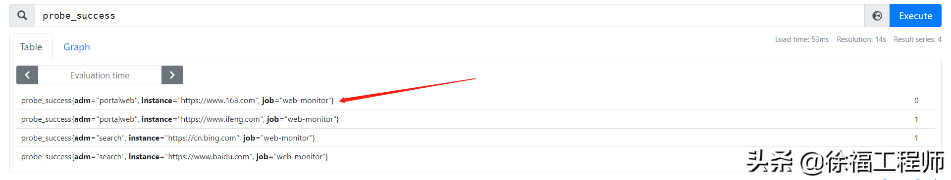 在Prometheus上查看probe_success metric的值,看到此时链接“https://www.163.com”访问异常(当然不是真的有问题,可以使用一些手段模拟)。
