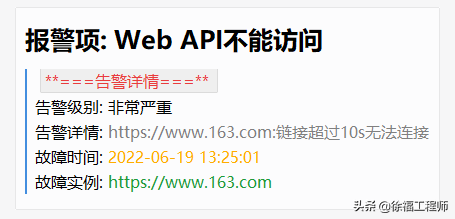 其中语句“{{ ($alert.StartsAt.Add 28800e9).Format "2006-01-02 15:04:05" }}”是将时间转换成北京时间,否则默认显示的是UTC时间,不利于故障发生时间的查看。