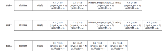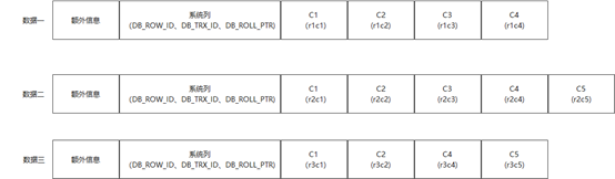 由于 INSTANT ADD / DROP 操作并不会修改存量数据,因此磁盘上的实际数据如下图所示,其中数据一多了 C3 列,缺少 C5 列,数据二多了 C3 列。