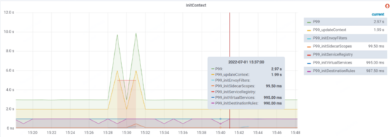 本文主要分享在当前的体量下,回答上述问题,使控制面平稳支撑大规模 Sidecar 的落地,通过下述优化之后,测试域(Istio CR量级在1W+)如下图所示:
