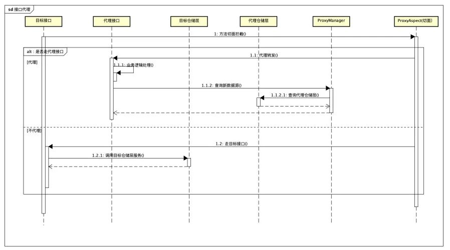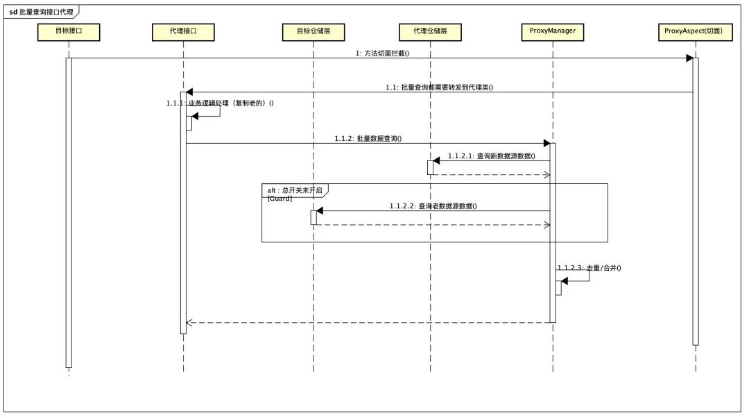 查询老数据,业务定义,用supply函数封装查询逻辑查询新数据,业务定义,用supply函数封装查询逻辑合并去重,抽象出统一的合并工具核心的流程如下图所示,目标接口的目标方法都会被切面拦截,转发到代理接口。代理接口在调用数据源的地方可以进一步转发给ProxyManager进行查询&合并。如果总开关未开启,说明全量数据还没有迁移验证完毕,那么还是需要查老的数据源(防止数据遗漏)。如果开关开启了,则说明迁移完成,此时不会再调用原来的仓储层服务,达到了对老的数据源收口的目的。